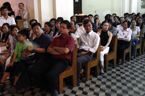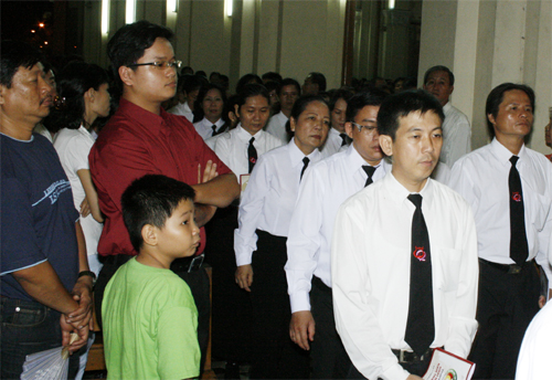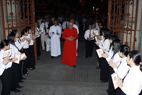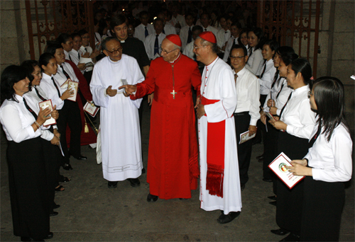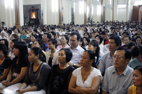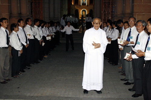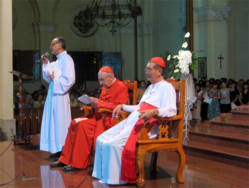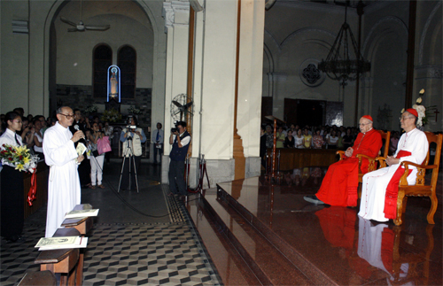 Lúc 18g30 Đức Hồng Y R. Etchegaray và Đức Hồng Y GB Phạm Minh Mẫn cùng bước vào Nhà thờ Đức Bà trong tiếng vỗ tay chúc mừng. Trước đó 10 phút, Đức Cha Phêrô Nguyễn Văn Khảm cũng đã lặng lẽ xuất hiện trước cửa phụ bên phải.