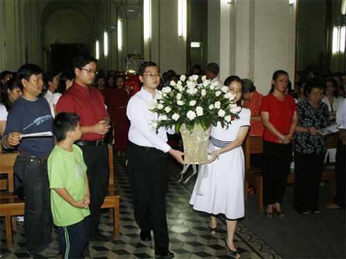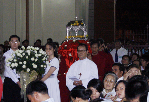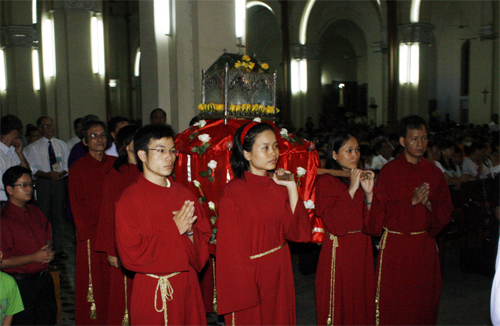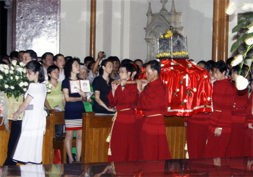 Trước Thánh lễ có nghi thức rước kiệu Tôn vinh các Thánh Tử đạo Việt Nam. Cộng đoàn hiệp thông lời kinh cầu nguyện cùng đoàn rước đang tiến lên dọc theo dãy hành lang bên trong nhà thờ. Những người có mặt trong thánh đường hôm nay sẽ không bao giờ quên âm điệu mạnh mẽ và hùng tráng của những bài ca ca ngợi các Thánh Tử đạo Việt Nam liên tiếp vang lên, như bay vút lên những mái vòm cao của Thánh đường. Những bộ đồng phục khác nhau, cùng sắc hoa và ánh nến của đoàn rước bỗng gợi một không khí thánh thiện, trang nghiêm khó tả, làm người tham dự như đang ở cõi thiêng liêng nào.